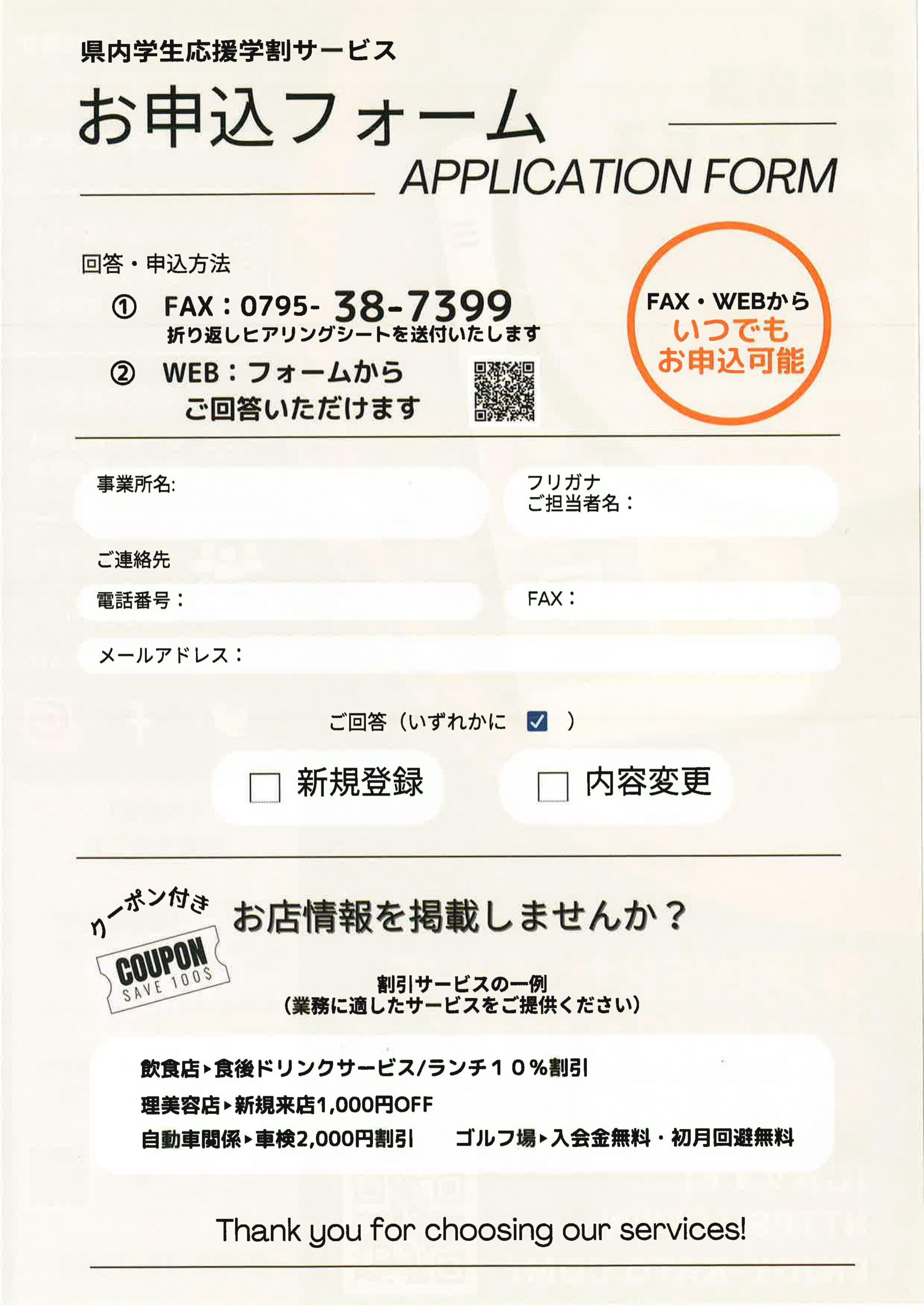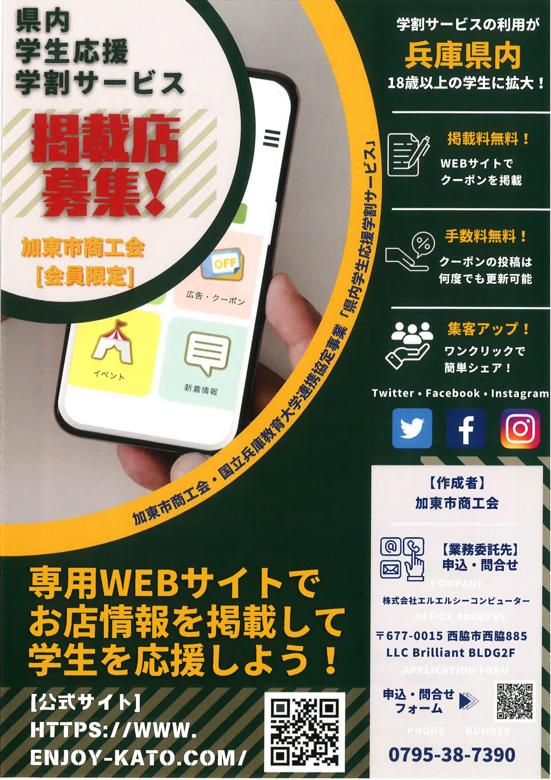 加東市商工会では、県内の学生がスマートフォンやタブレットでクーポン画面を提示することで割引が受けられる 学生向けサービスサイト を運営しています。